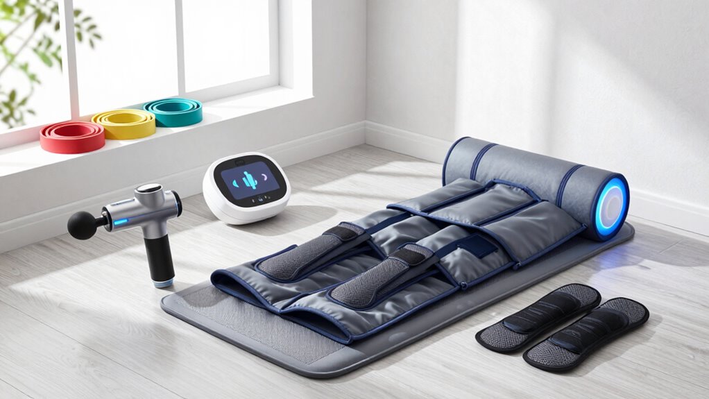 Choosing the right recovery products for your home physical therapy setup starts with making certain they align with your specific exercise goals. I focus on selecting equipment that supports my objectives, whether it’s improving range of motion, building strength, or increasing flexibility. Adjustable resistance or support levels are key, as they help me match the equipment to my current stage of recovery. I also make sure the tools I pick are suitable for the exercises prescribed by my therapist, targeting the relevant muscle groups or joints. Versatility matters too—products that can handle multiple exercises or progression keep my routines effective as I improve. Ultimately, the right tools should seamlessly support my goals, making my recovery both efficient and tailored to my needs.