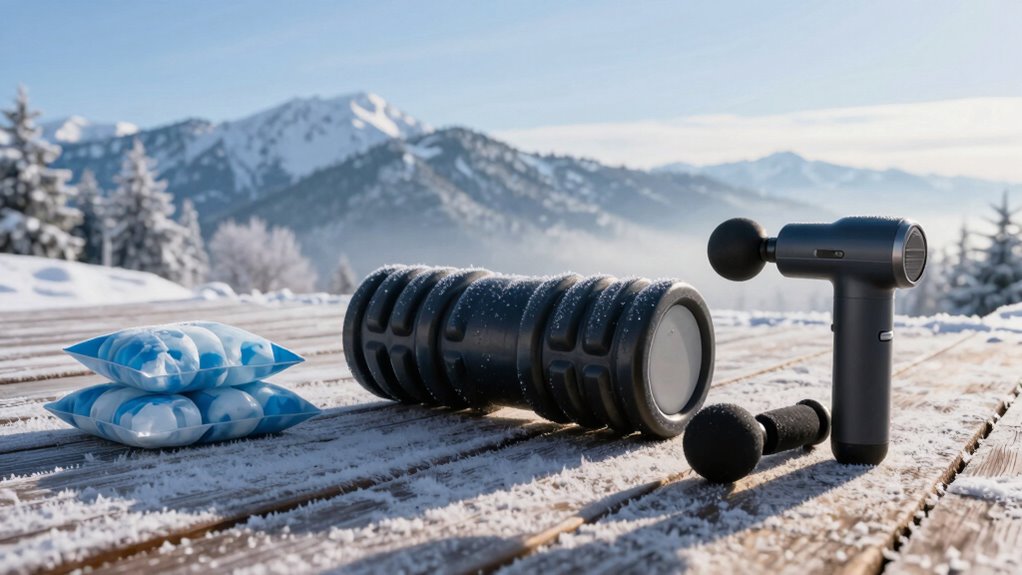 I recommend thermal compression sleeves and hot/cold packs for cold weather athletes. These products help manage muscle stiffness and promote circulation, which is essential in cold conditions. I also find foam rollers with textured surfaces effective for deep tissue massage, warming up muscles, and reducing soreness. Combining these tools with proper hydration and nutrition guarantees I stay resilient and recover faster during winter training.